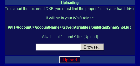 Note: A common problem people encounter when uploading the file is that they report that the upload process produced no results. Most of the time it's a result of uploading the WRONG GuildRaidSnapShot.lua file. They are usually loading the file from WoW/Interface/Addons/GuildRaidSnapShot/GuildRaidSnapShot.lua. The file must be uploaded from WoW/WTF/Accounts/AccountName/SavedVariables/GuildRaidSnapShot.lua