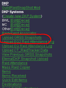 Before you can upload the attendance, you will need to either close WoW or type /console reloadui. Either one of those will force the file to be saved to the hard drive, and that is what's required to upload. Once one of these two things are done, you can head over to the Admin section of your website, and go to "Upload GRSS Snapshot"
