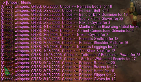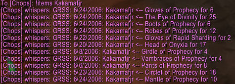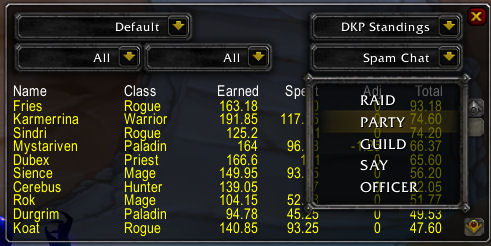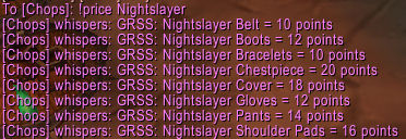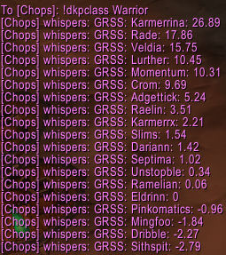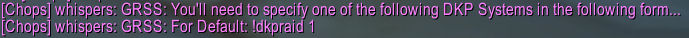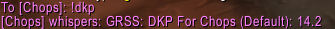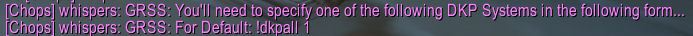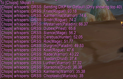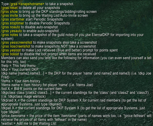 In addition to the in-game windows and fun stuff like that, there are a number of commands available for members of your guild and raid to view various DKP-related info by sending tells to you. These are summarized both by typing /grss and by sending a tell containing !help.