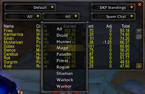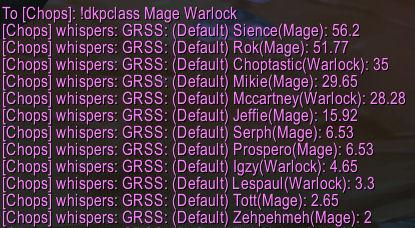 !dkpclass class1 class2... Retrieve the current standings of all players in the listed classes (you may specify more than one if you wish)