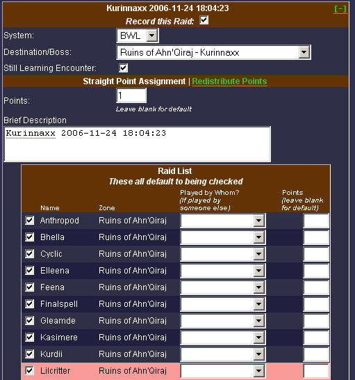 Choose a destination, fix the date (if necessary), if someone should get a different amount of points than the default, you can specify those different point values in the box to the right of the names. Additionally, if someone happens to have been playing on an alt, and you wish to assign those points to the main character, or if someone was playing on someone else's character and you want to give those points to the character of the person who was playing, you can choose the character to whom you'd like to give the points from the drop down list.
