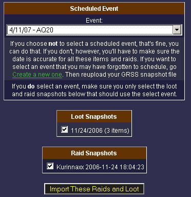 Here you will see a brief summary of the file you uploaded. Choose a calendar event from the drop down box at the top, and check the boxes next to the appropriate loot and raids you wish to import (all boxes are checked by default).