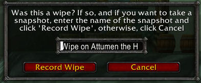 Clicking "Record Wipe" will take a snapshot named from the contents of the text box in that window. The default is "Wipe on <Last Boss Mob Targeted>". This popup will only appear in a Raid, and not while in a party.