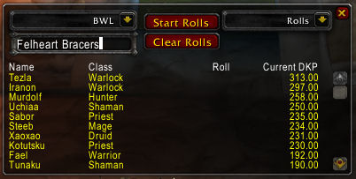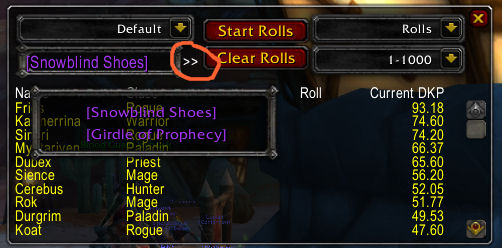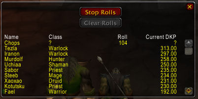 You'll see that each roll is displayed next to the name of the player who rolled. When you are finished with rolling, you can click "Stop Rolls" and it'll stop capturing rolls, as well as notifying the raid that rolling has stopped. You can then click the "Rolls" header and it'll sort it by highest roll. After handing out loot, it's advisable to click "clear rolls" which will then remove all rolls from the list.