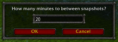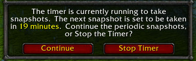 Note: Due to the nature of the "GetTime()" in WoW, if you restart your computer, the periodic snapshots will not be able to smoothly resume. If this must happen, it's advised to stop the snapshot timer, and restart it.