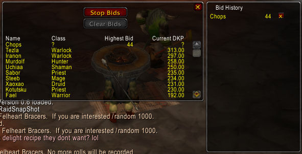 Notice that all bids are accepted by having the bidders send tells to the "looter" or whoever is running the GRSS mod like this: