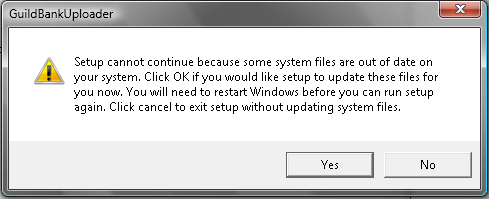 If during installation you get the notification that "System Files are out of date..." you'll need to click "OK" to let the system reboot to install newer system files, and when windows reloads, run the installer again.