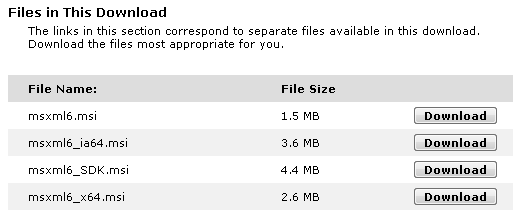 If you are running standard 32-bit Windows or you are unsure what kind of windows you are running, then click "Download" next to the one labeled "msxml6.msi." Otherwise, if you are running 64-bit Windows, download "msxml6_x64.msi".