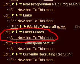 Our new section will now show on our Menu Admin mockup as below. We'll want to click "Add New Item To this Menu" under "Class Guides"