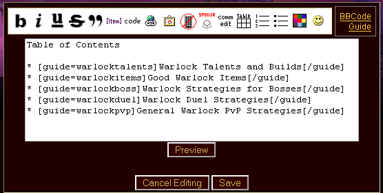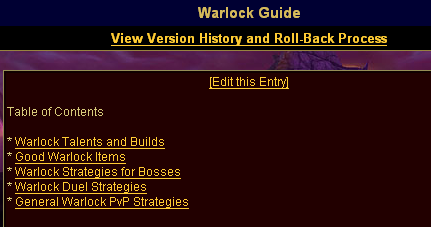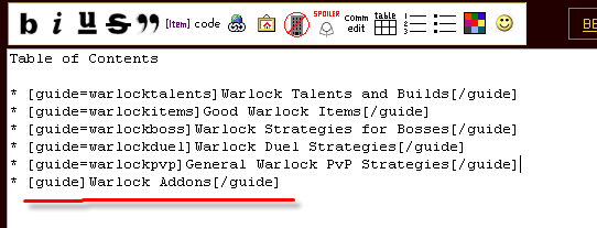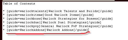 And saved, it would have looked first for a guide with Easy Link Text of "warlockguide" (cutting the spaces out), but upon failure, it would have looked for a guide with the title "Warlock Guide" (from the Link Label). In this case, it would succeed, and replace the link with the appropriate link: